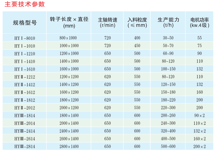 | 規格型號 | 轉子長度*直徑(mm) | 主軸轉速(r/min) | 入料粒度(≤mm) | 生產能力(t/h) | 電機功率(kw.4級) |